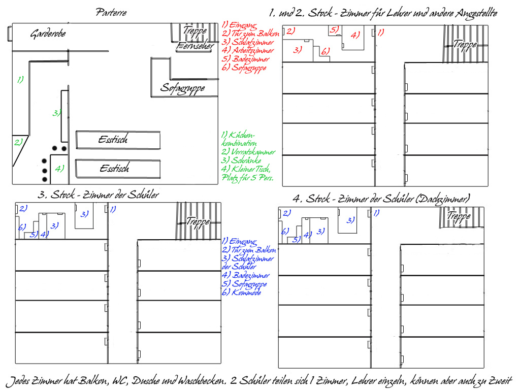 2 Schüler teilen sich 1 Zimmer. Ein solches Zimmer entspricht einer 3 1/2 Zimmerwohnung. Jeder Schüler hat ein eigenes Zimmer. In jedem Zimmer befindet sich eine Kommode für die Kleider.
